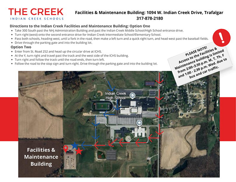 The NHJ United School Corporation, Indian Creek Schools, has completed a new transportation and maintenance facility on the southwest corner of the property. The facility features three bays, a bus lift and a wash bay. Additional space houses custodial supplies, mowers and maintenance equipment and parts. Administrative offices and a conference room are located on-site, as well as bus parking and a fuel island.