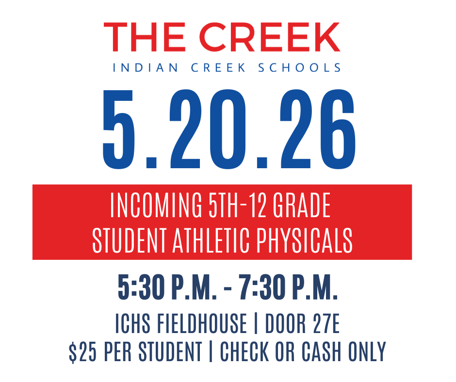 Indian Creek will host student-athlete physicals for incoming 5th-12th graders at the ICHS Fieldhouse on May 20 from 5:30 to 7:30 p.m. Cost is $25 per student, cash or check only. Please enter through door 27e.