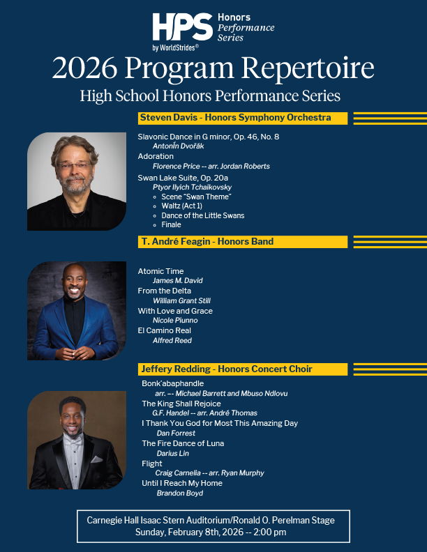 The Honors Performance Series was created to showcase accomplished individual student performers on an international level by allowing them to study under master conductors and perform in world renowned venues. The Honors Performance Series is proudly presented by WorldStrides, the nation’s leading educational travel organization. Learn more by visiting honorsperformance.org and worldstrides.com.