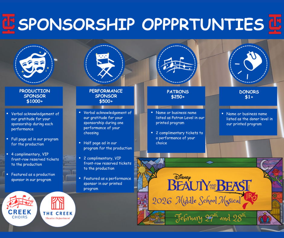 Every year, Indian Creek Middle School puts on a musical production, and it is one of our favorite events! We adore seeing our community come together to support our students as they dip their toes into musical theatre. As you can imagine, putting on a production is a massive undertaking. It takes immense amounts of time, resources, and labor to make a production a success for performers and audience alike. This year, we are putting on Beauty and the Beast Jr., and it may be our most elaborate production ever! We are currently seeking local businesses and individuals willing to sponsor our show this season. This could be done either by donating set-building/prop materials or by providing monetary support. Below, we have added some more information about being a Creek Theatre sponsor. Please reach out to sburkey@nhj.k12.in.us if you are interested in sponsoring our production of Beauty and the Beast Jr.